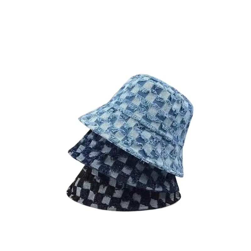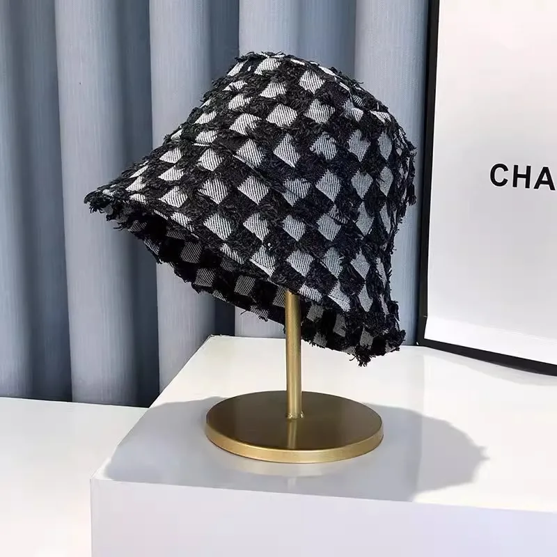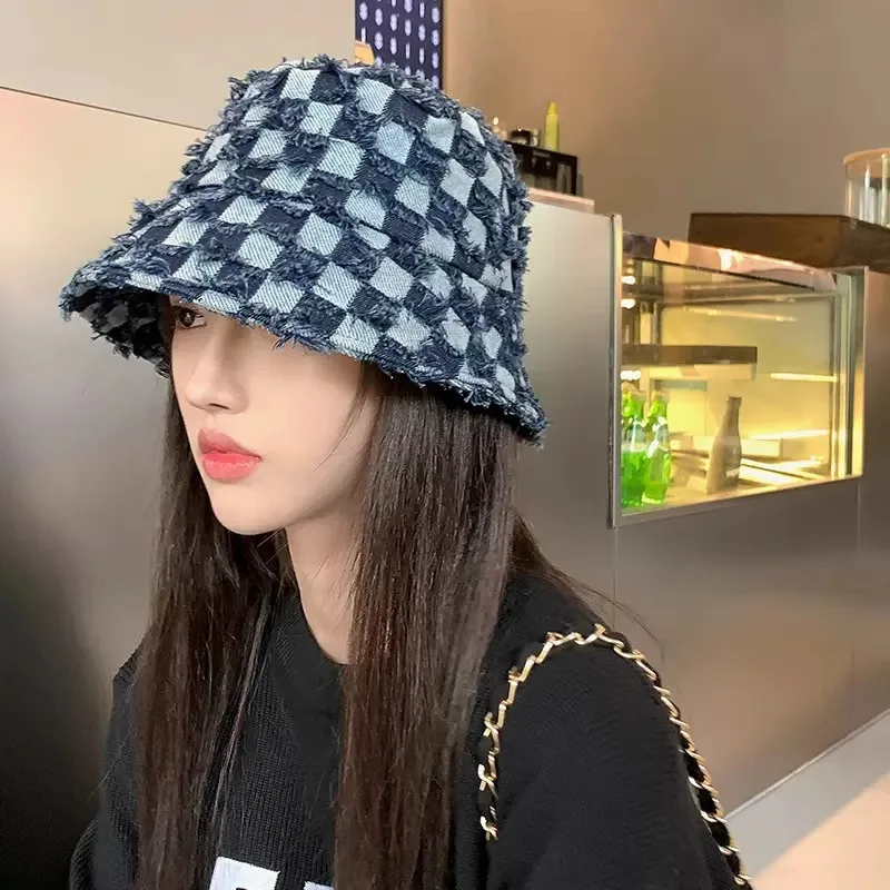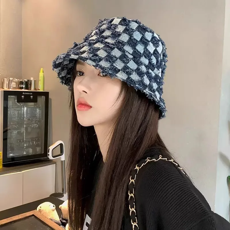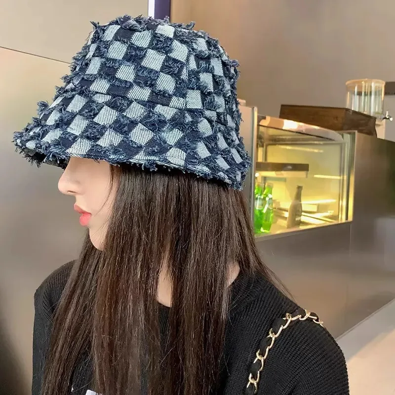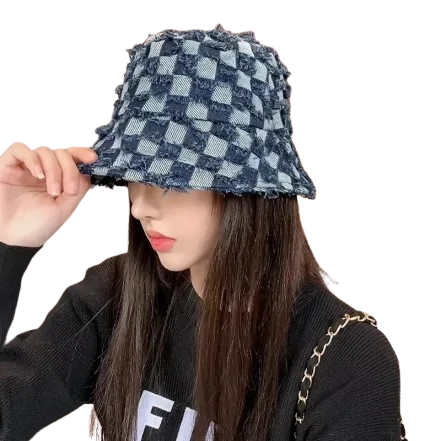 - Bob à carreaux en denim pour un style vintage.